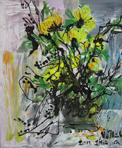 A number of her outstanding artworks on this exhibition must be mentioned are “Golden bonsai”- Oil & Acrylic, 50×60 cm- By means of the strong and liberal strokes together with yellow as the theme colour, she describes shaking classifier for flowers, so viewers could perceive moisture and sweet perfume on each petal. The light grey-blue colour manifests Spring drizzle.