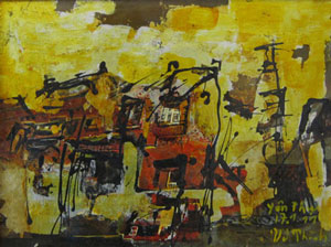 Harmony, tranquility and joy are common themes in Van Duong Thanh’s uplifting paintings. The sprigs of resplendent flowers at Tet, “The bashful girl beside a lotus bud” or the sparkling colours in “Happiness reflects”…made us experience the variety in lay-out as well as the great emotion in tones of colours.